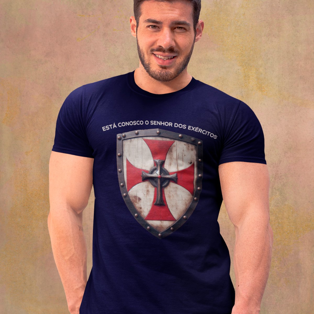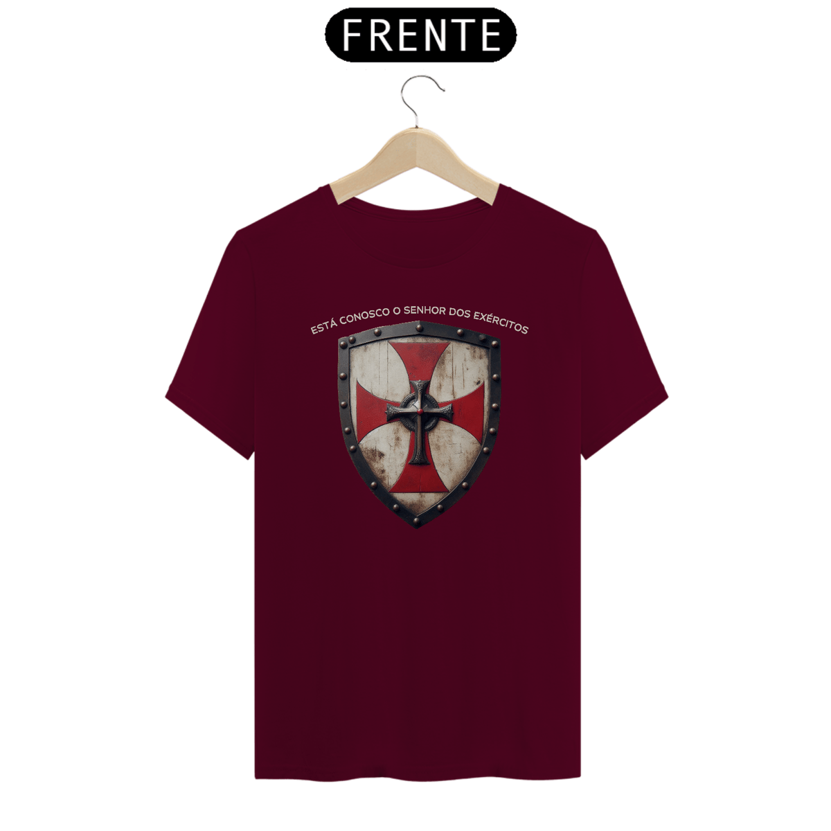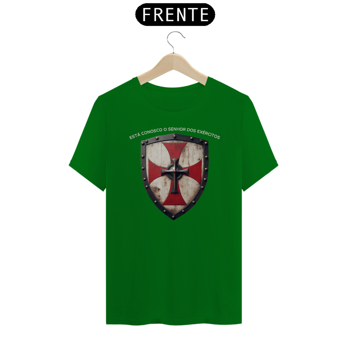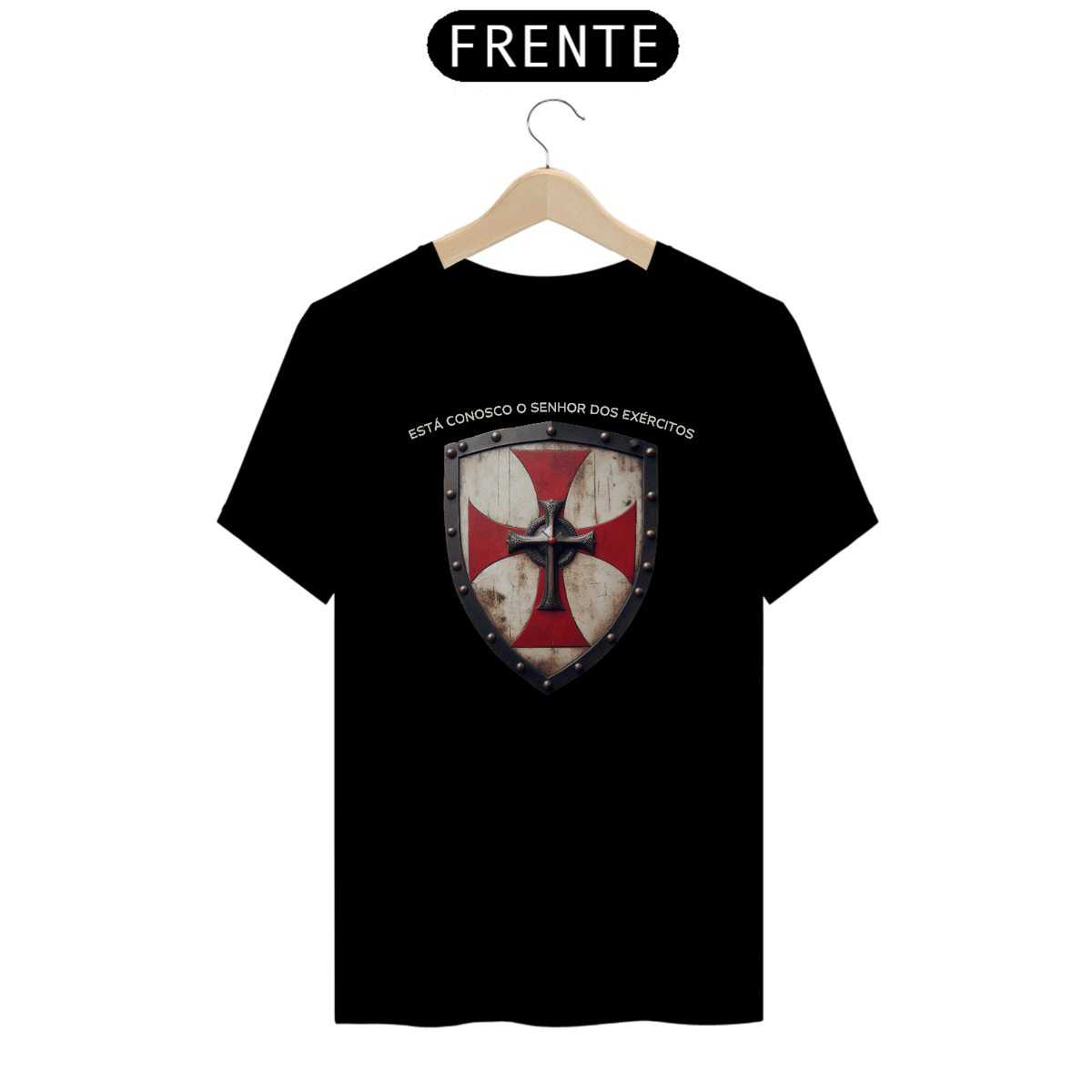 A camiseta "Senhor dos Exércitos" traz o poderoso símbolo da cruz templária com um escudo, representando a proteção e a força que vêm de Deus.